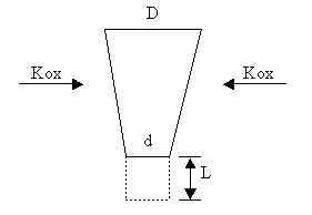 Em primeiro lugar há de ser considerado que o eletrodo depois de um certo tempo adquire o perfil da figura 1. O eletrodo vai-se afinando a medida que chega à ponta devido à oxidação lateral. A porção de grafita que está em determinado momento na ponta do eletrodo já esteve algumas horas ( ou dias ) antes na parte superior do mesmo e sofreu durante todo esse tempo um desgaste lateral que diminuiu o diâmetro de D para d. Apesar que a oxidação está desgastando o eletrodo, o consumo efetivo só vai ser computado a medida que o comprimento do eletrodo diminua ( exceto no caso que o eletrodo sem circulação de corrente permaneça tanto tempo dentro do forno como para se consumir totalmente em forma lateral, o que seria um caso irreal ).